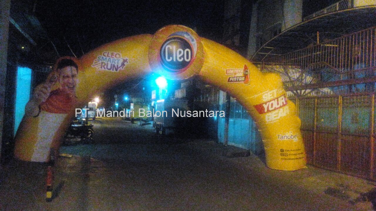 • Balon Gate Cleo. Balon ini diproduksi menggunakan bahan tarpaulin dengan ukuran 4 x 8 m. selain untuk promosi balon ini digunakan untuk start atau tanda dimulainya lomba lari tersebut. lihat juga produk balon gate lengkap di Balon Gate Mandiri Balon